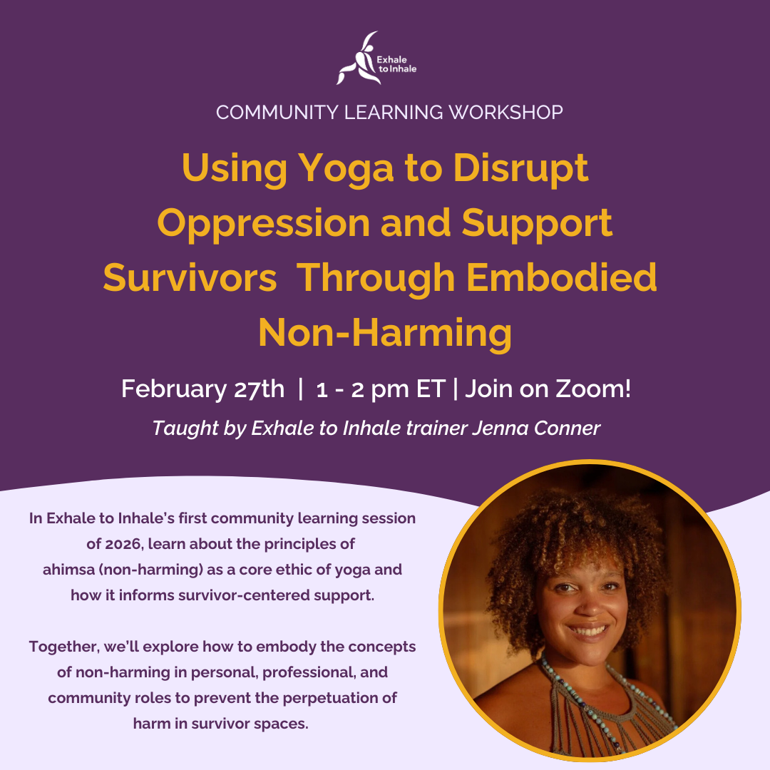 Join Exhale to Inhale’s 2026 community learning series to deepen your understanding of yoga’s influential role in survivor healing.